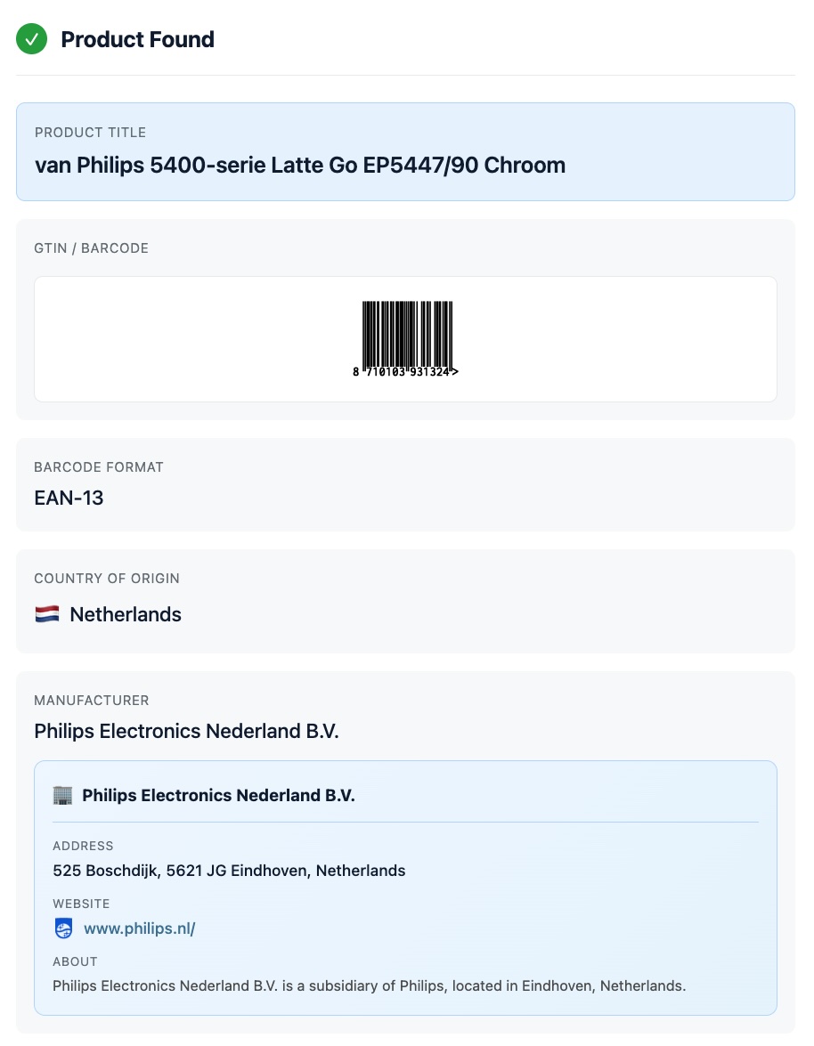 Instantly retrieve product details from any barcode. Enter a GTIN, EAN, UPC, or ISBN to discover the product title, description, manufacturer, country of origin, and company contact information.